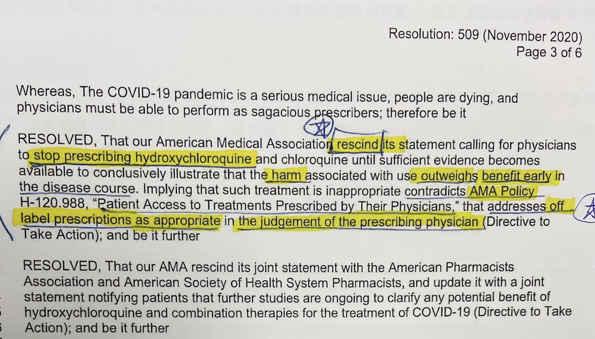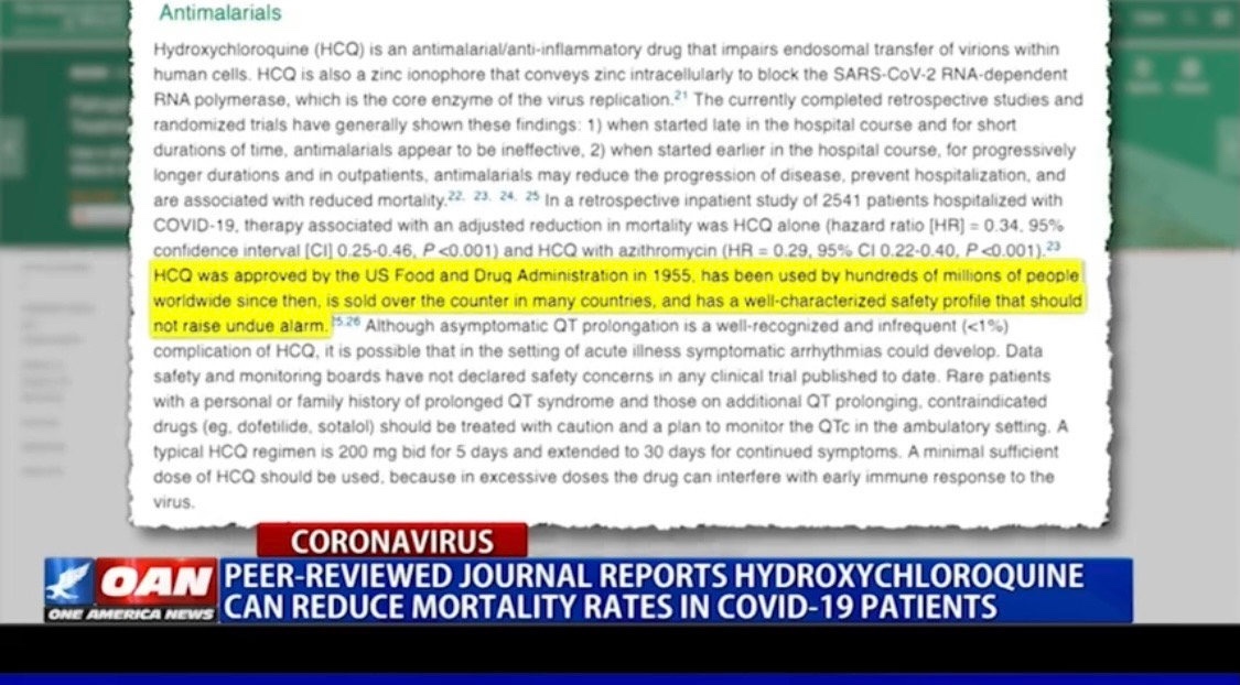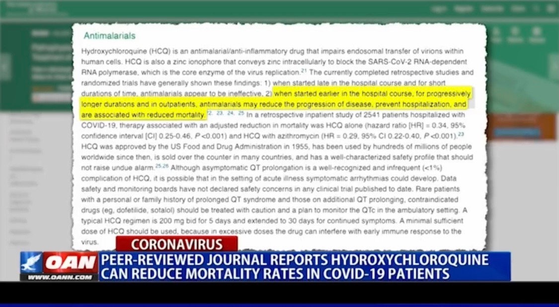 민주당원들과 주류 언론은 1년 이상 동안 하이드록시 클로로퀸이 위험하다고 거짓말을 주장함으로써 많은 사람이 조기에 치료할 수 있는 기회를앗아갔으며, 윤리와 생명을 직접적으로 위협하였습니다.