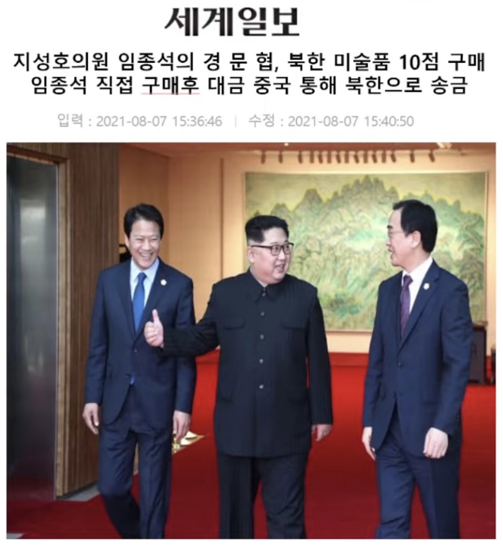 국가 정보원의 익명 소식통은 계속해서 “임종석씨가 구입한 북한 그림들은 유엔의 대북 제재 대상 그림들이며 북한으로 송금 한 수억 원은 대금 역시 임종석씨가 대놓고 미국과 유엔의 대북 제재 위반 한 사항이다.