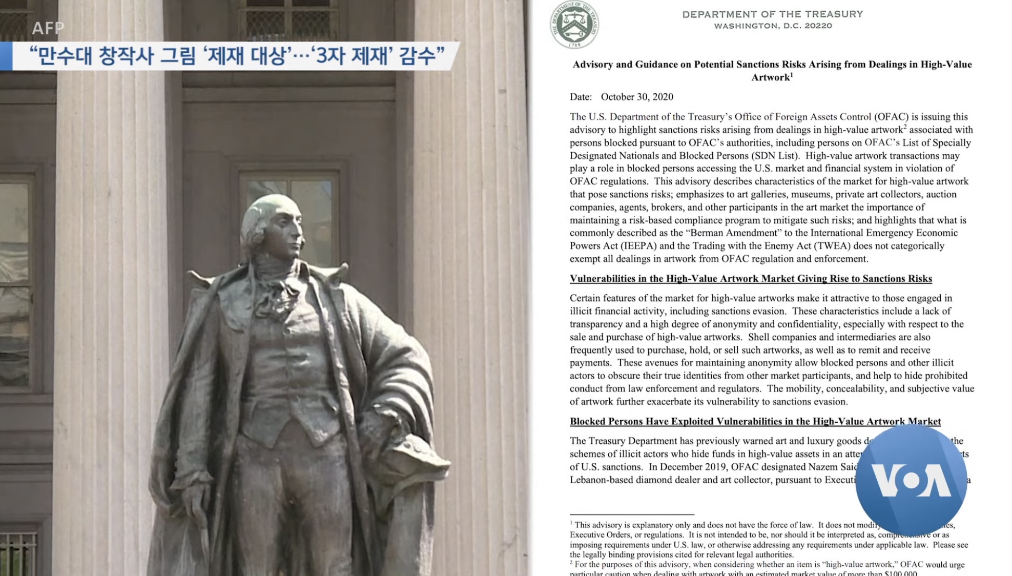 미국 재무부는 지난해 발표한 주의보를 통해 북한 등 제재 대상이 연관된 고가 미술품 거래에 따른 제재 위반 위험을 경고하면서, 이 같은 행위가 제재 대상들이 미국 시장과 금융망에 접근하는 것을 도와줄 수 있다고 지적했습니다.