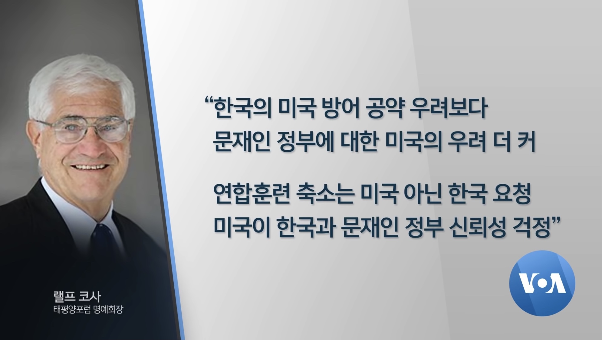 랠프 코사 태평양포럼 명예회장은 한국이 미국의 방어 공약을 우려하는 것보다 문재인 정부에 대한 미국의 우려가 더 크다고 지적했습니다. “연합훈련 축소는 미국이 아니라 한국이 요청한 것으로, 미국이 한국과 문재인 대통령의 신뢰성을 걱정하고 있는 것이지 그 반대 상황이 아니다”라는 비판입니다.