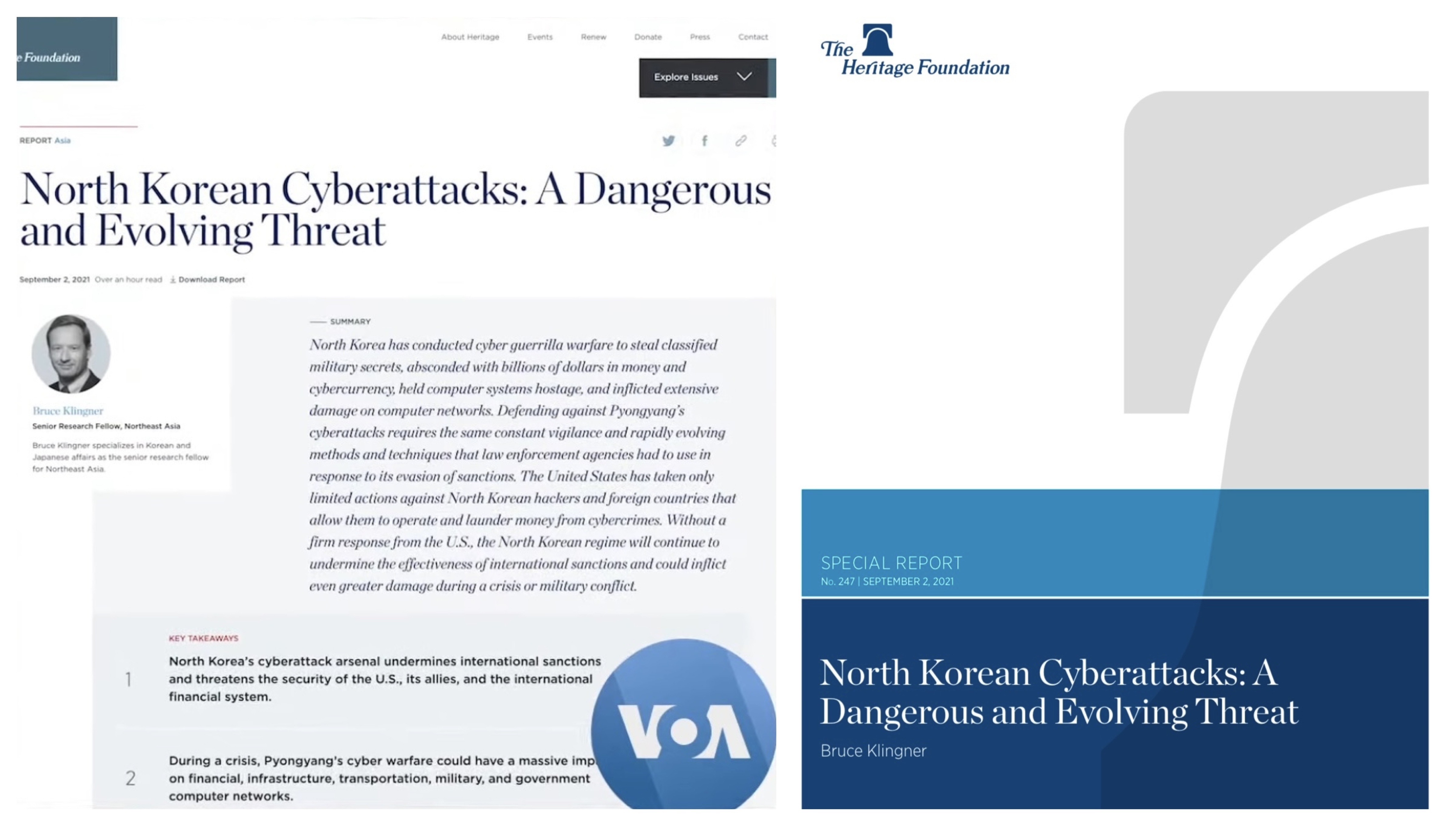 워싱턴의 민간 연구단체인 헤리티지재단은 2일 발간한 ‘북한의 사이버 공격: 위험하고 진화하는 위협’이라는 보고서에서 이같이 밝혔습니다.