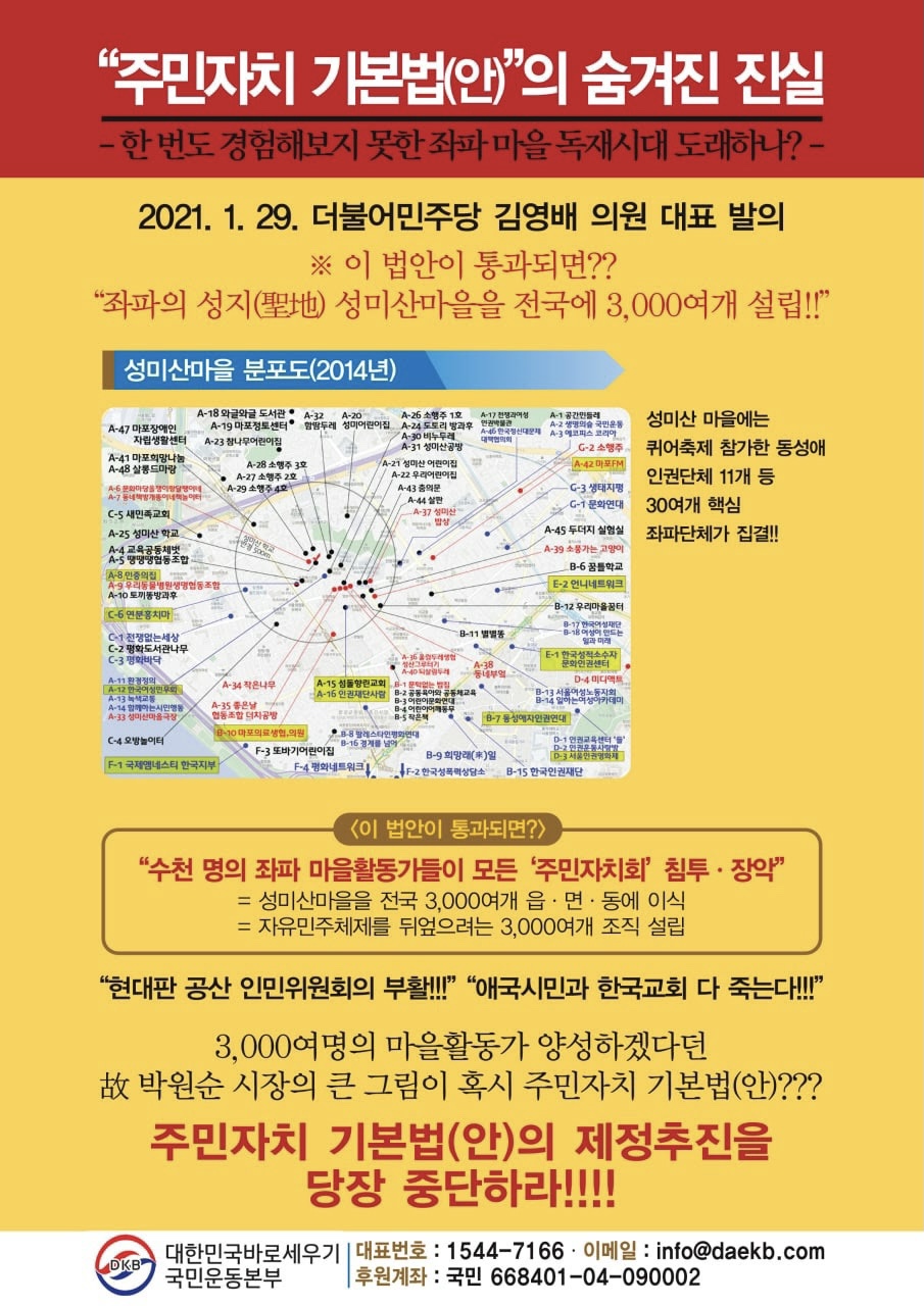 이 대표는 “이 규정에 따라 민노총, 전교조 등 특정 이념을 가진 단체나 활동가들이 얼마든지 마을에 들어와 활동할 수 있고 주민총회와 지역 주도권을 장악할 수 있다”고 진단했다.