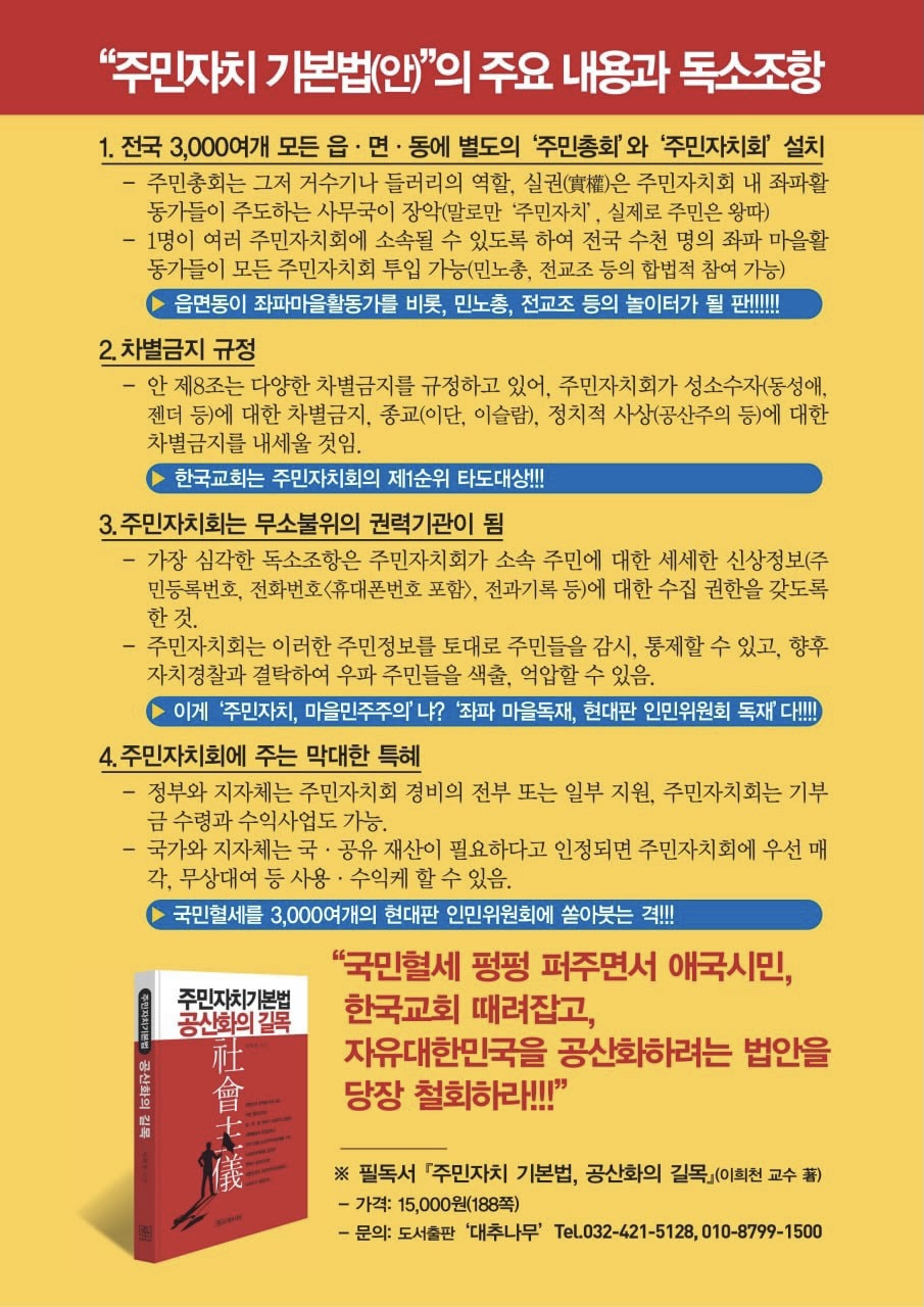 이희천 자유수호포럼 공동대표는 주민자치법에 대해 “대한민국 말단 행정조직인 3,491개의 읍·면·동을 법인격을 가진 새로운 자치단체로 만들려는 것”이라며 “좌파 성향의 세력이 새로운 자치단체의 주도권을 장악해 마을 단위 독재체제를 구축하려는 게 이 법안의 본질적 목적”이라고 주장했다.