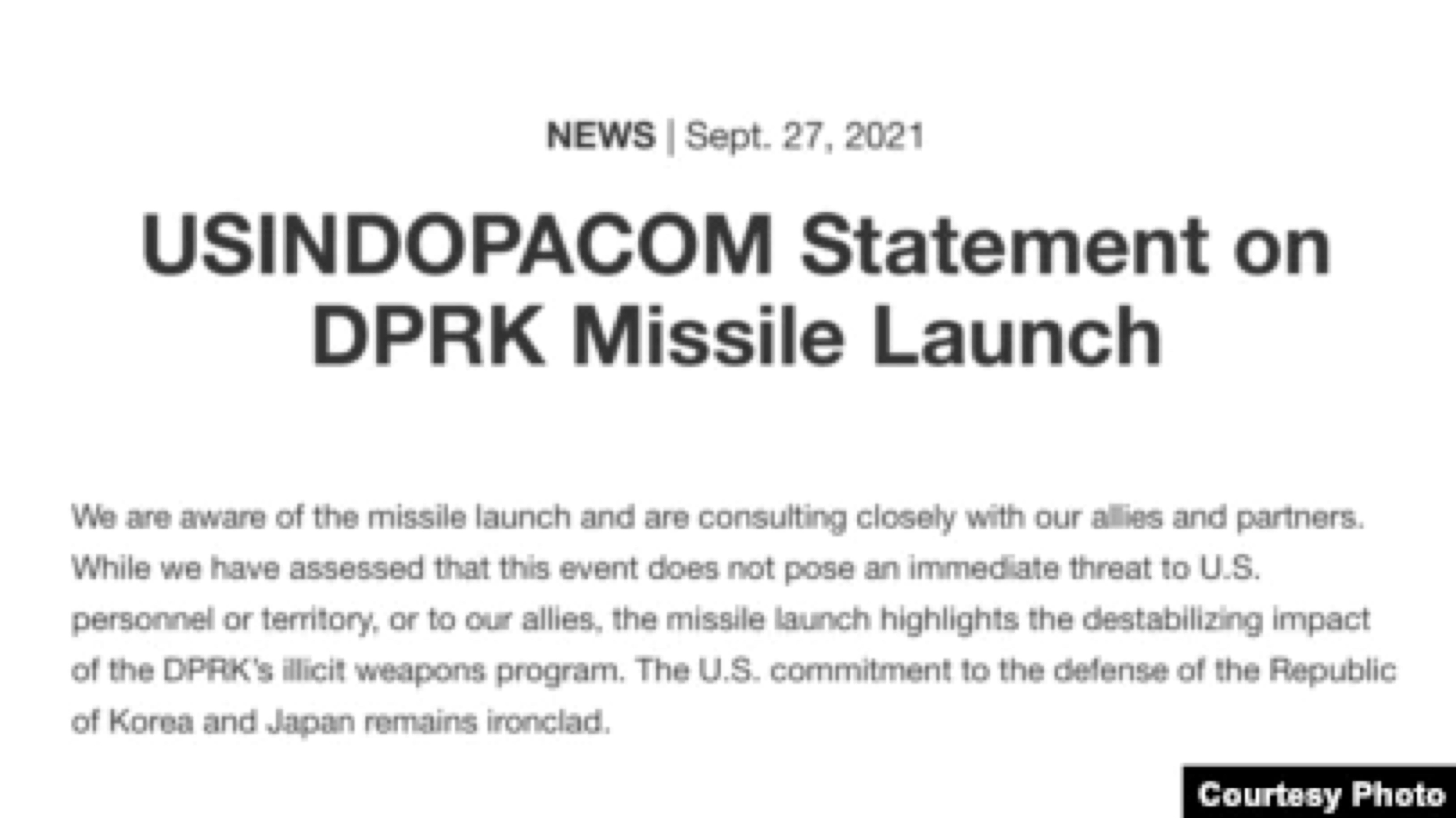 [인도태평양사령부 성명] “We are aware of the missile launch and are consulting closely with our allies and partners. While we have assessed that this event does not pose an immediate threat to U.S. personnel or territory or to our allies, the missile launch highlights the destabilizing impact of the DPRK’s illicit weapons program. The U.S. commitment to the defense of the ROK and Japan remains ironclad.”