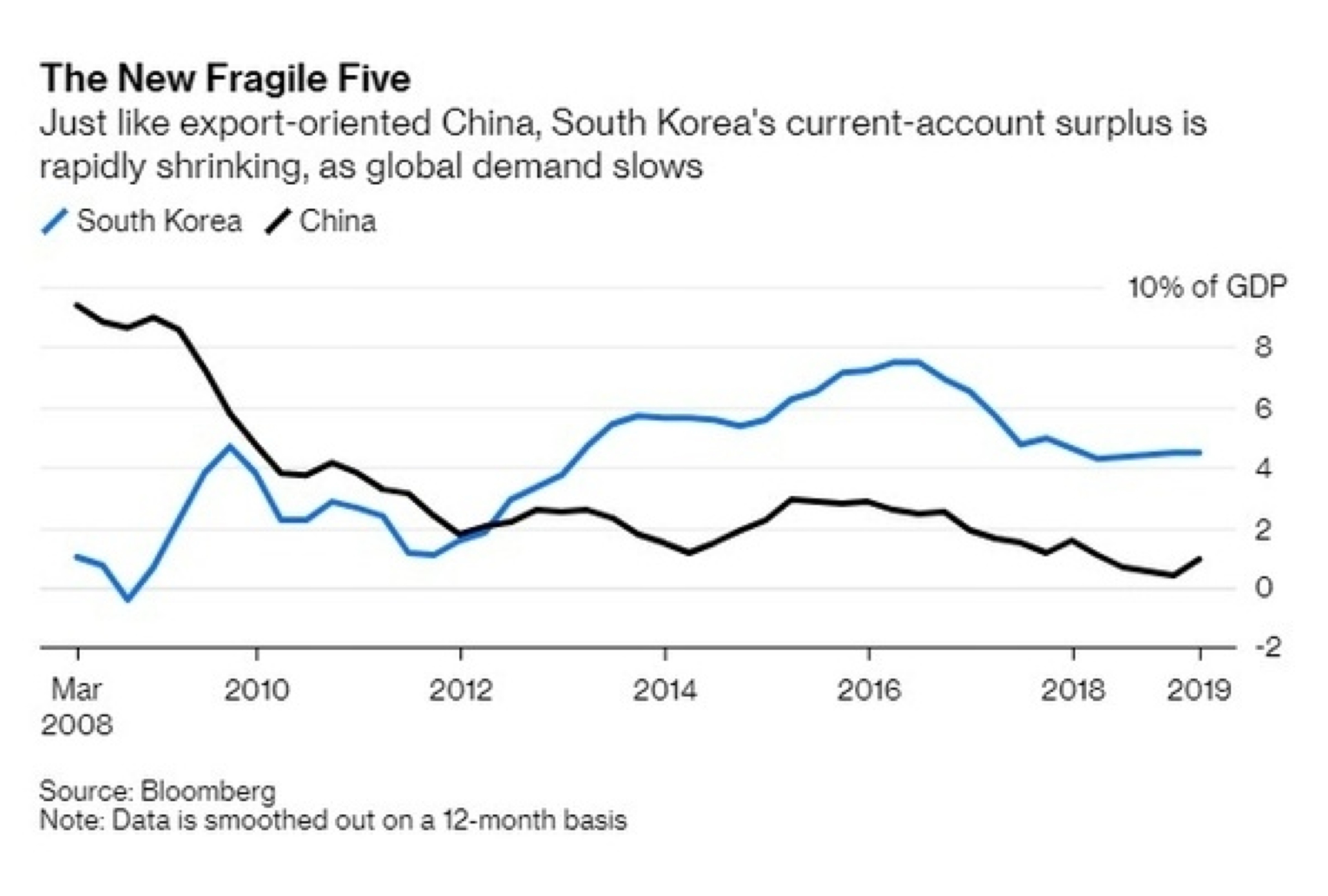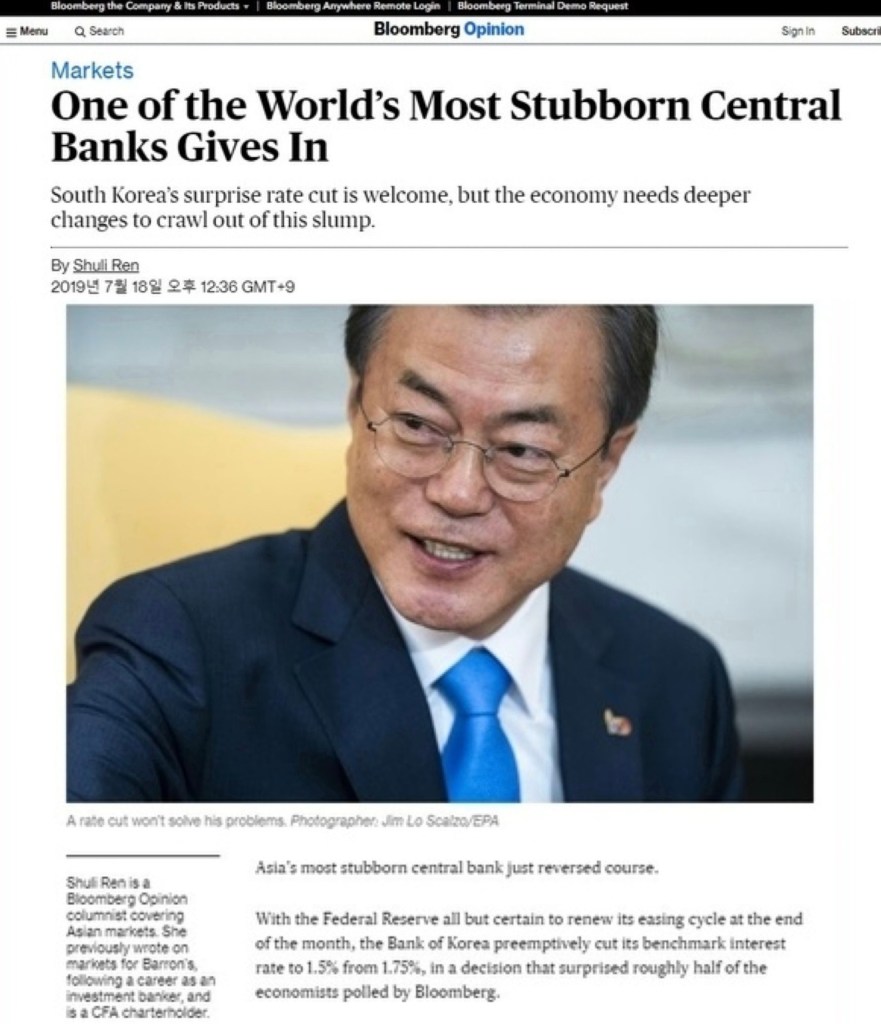 2019년 7월 18일(현지시각), 블룸버그(Bloomberg)는 ‘세계에서 가장 뻣뻣한 중앙은행 중에 하나가 항복했다(One of the World’s Most Stubborn Central Banks Gives In)’ 제하 슐리 렌(Shuli Ren) 아시아 경제 담당 분석가의 칼럼을 게재했다. 슐리 렌은 이번 칼럼에서 여러 충격적인 통계수치를 제시하며 문재인으로 인해 한국 경제가 갈수록 나락에 빠져들고 있음을 짚었다.