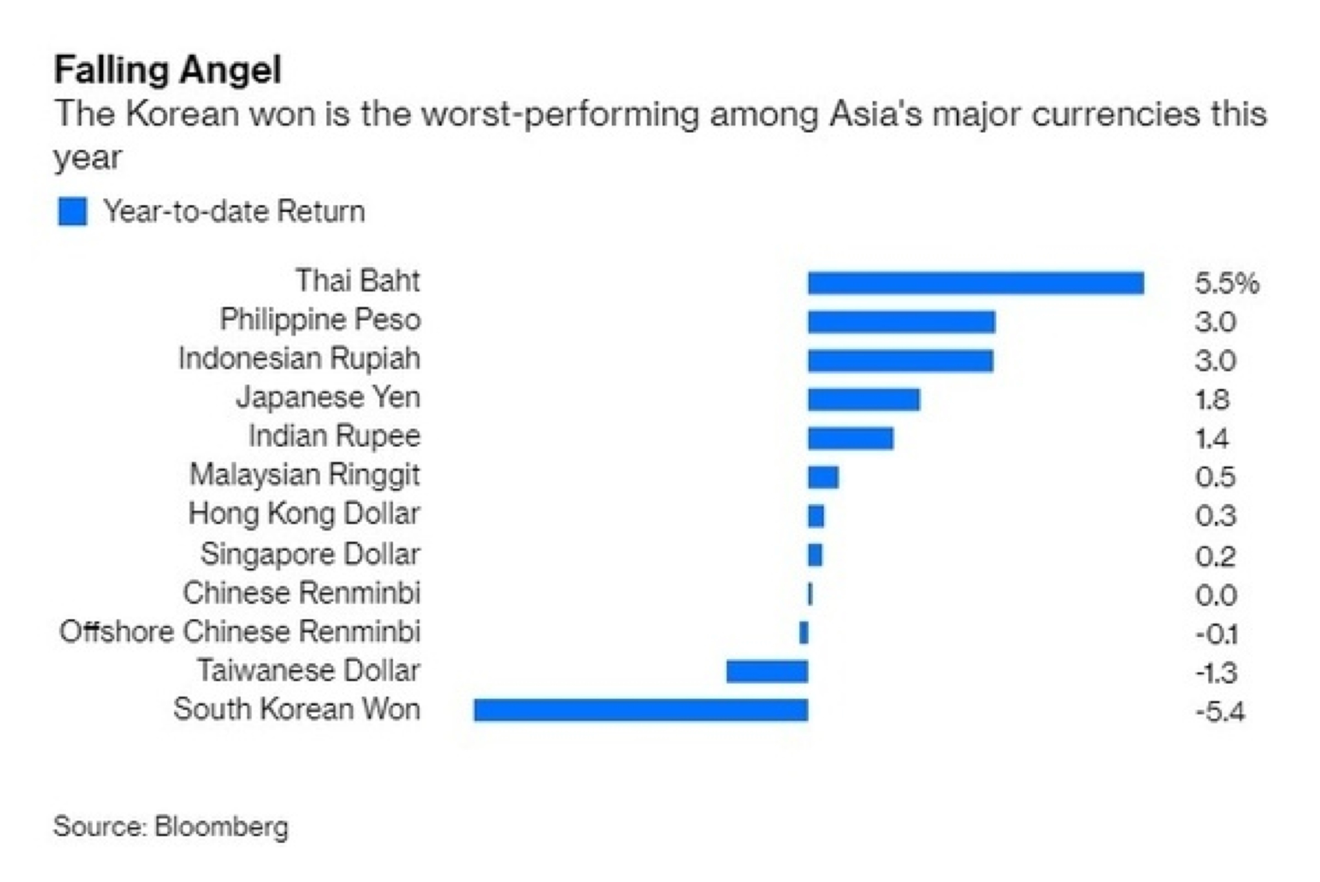 중앙은행의 목표는 시장의 안정이다 : 한때 ‘아시아의 호랑이(Asian Tiger)’였던 한국은 현재 ‘개집(doghouse)’ 신세다. 한국의 주식 시장이 파키스탄 다음으로 나쁜 성적을 내는 동안, 원화는 올해 달러기준으로 5.4%나 하락했다(The central bank aimed to calm markets: Once an Asian Tiger, South Korea is now in the doghouse. The Korean won has tumbled 5.4% this year, while its stock market is the region’s second worst-performing after Pakistan, on a dollar basis).