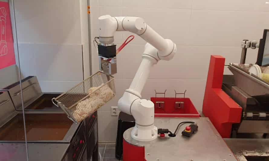 Robots brew coffee and bring beverages to tables in cafes. A robotic arm batters fries and chicken to perfection.