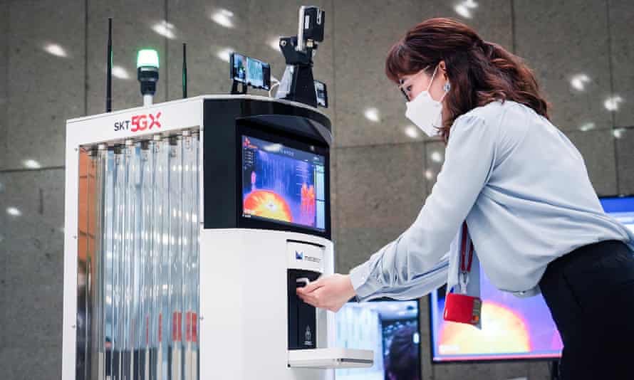 At Yongin Severance Hospital, Keemi – a 5G-powered disinfection robot – sprays hand sanitiser, checks body temperature, polices social distancing, and even tells people off for not wearing masks.