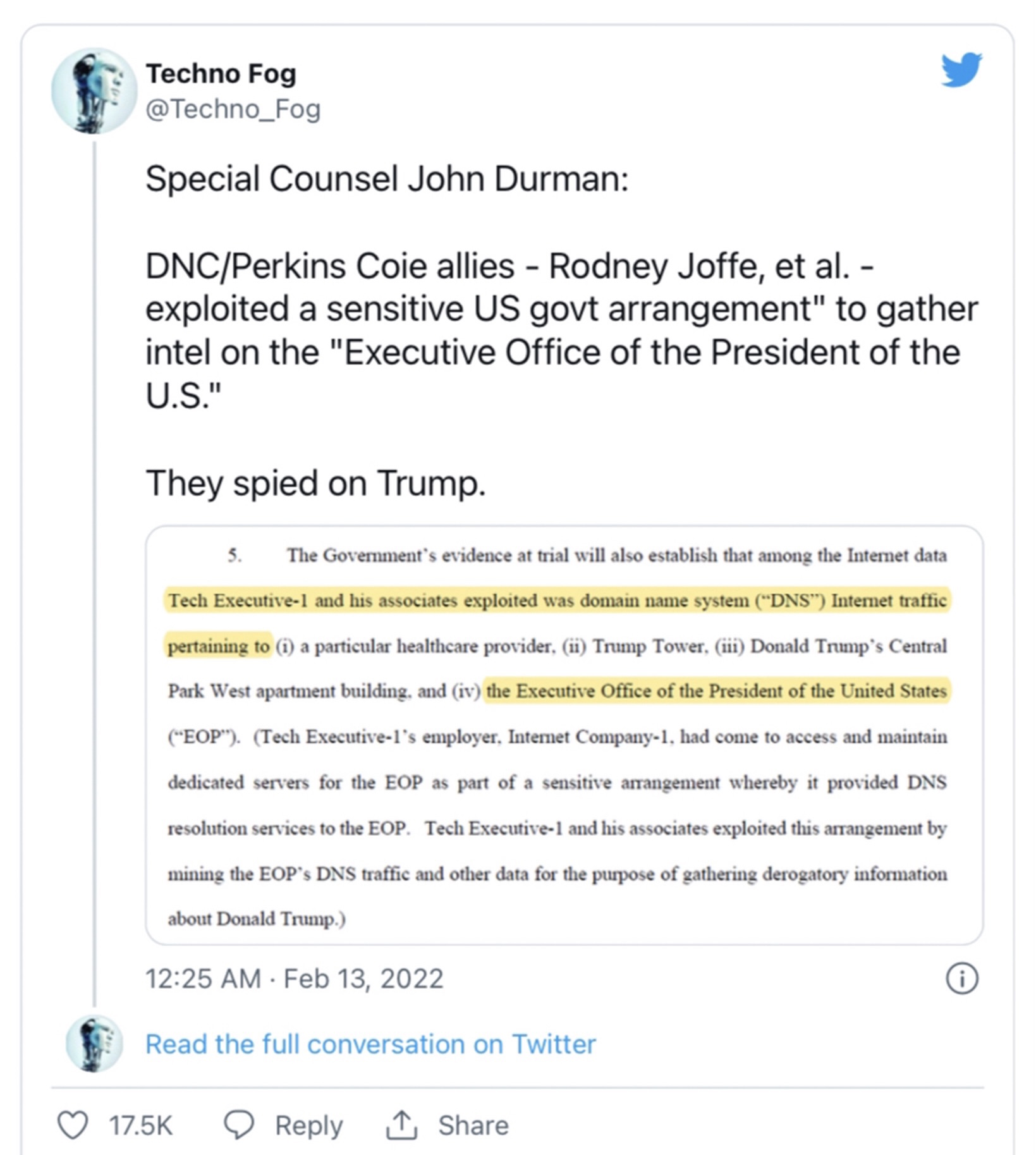 I provide that background because of what we just learned. Durham also divulged, to an extent, that contractors and tech experts (meaning Joffe and his cohorts) – those same people involved in the Alfa Bank hoax – essentially spied on President Trump.