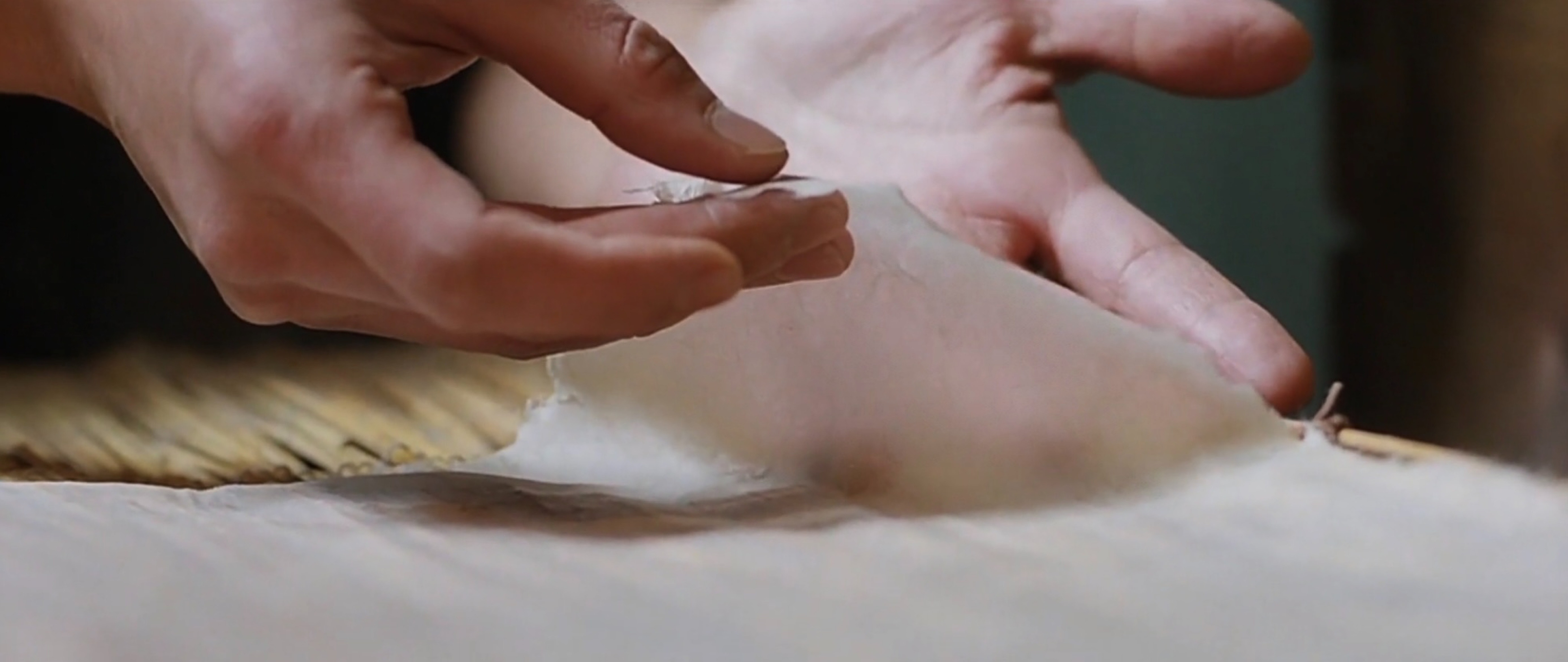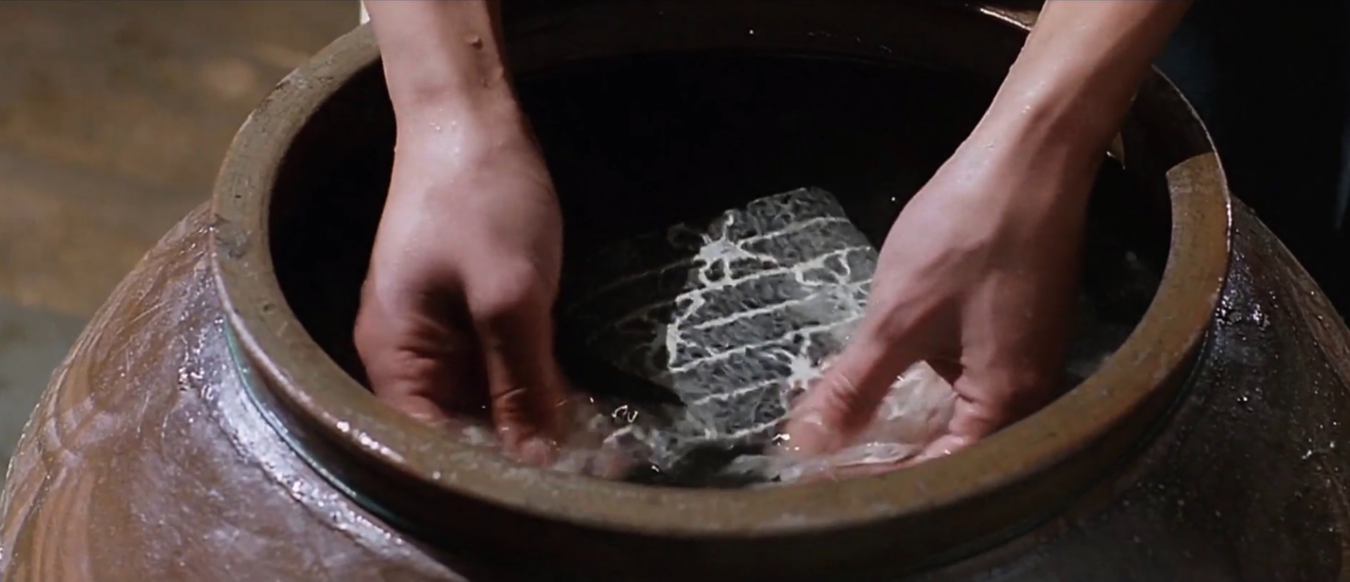 종이를 항아리에 담가서 살살 풀어요 그다음 채잡아서 말리고, 그러고 나서 낙엽하고 도토리 삶은 물로 색을 잡고